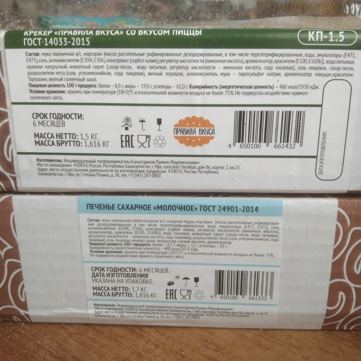 Условия хранения:Хранить при температуре 18+-5 и относительной влажности воздуха не более 75%. Не подвергать воздействию прямого солнечного светаСостав:мука пшеничная хлебопекарная, мука ржаная, сахарная пудра, маргарин (масла растительные рафинированные