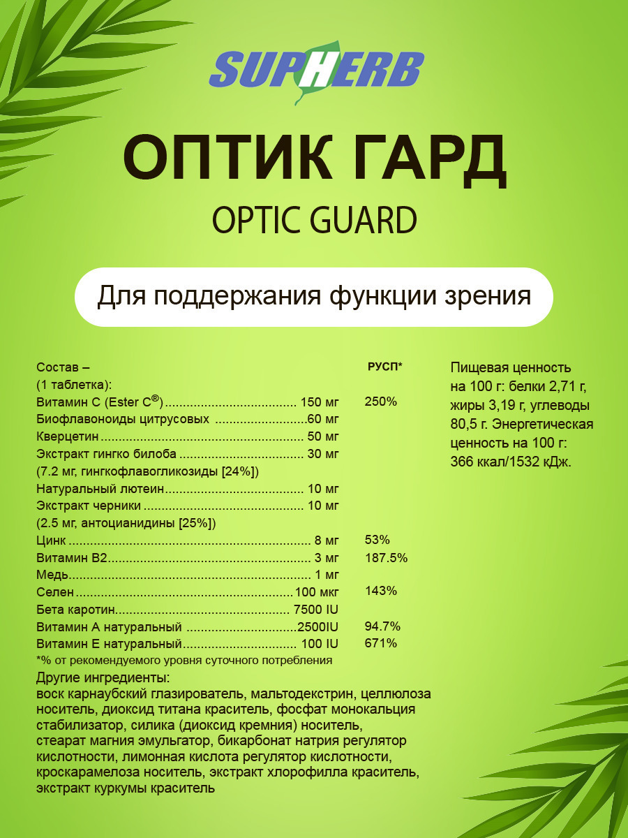 МНН/Действующее вещество:Натуральный лютеин – 10 мг, Витамин C – 150 мг, экстракт черники – 10 мг, биофлавоноиды цитрусовых – 60 мг, кверцетин – 50 мг, экстракт гинкго билоба – 30 мг, Витамин Е натуральный – 100 МЕ, Витамин B2 – 3 мг, цинк – 8 мг, медь –