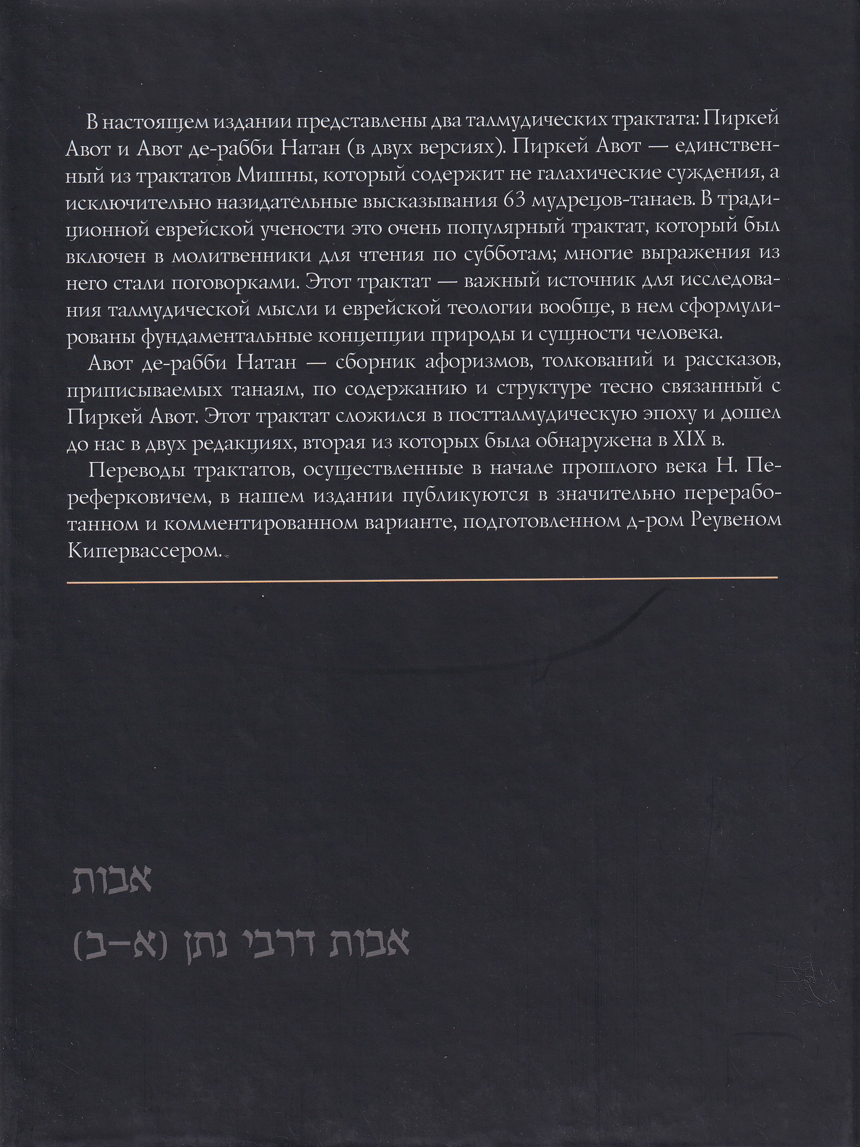 В настоящем издании представлены два талмудических трактата: Пиркей Авот и Авот де-рабби Натан (в двух версиях). Пиркей Авот - единственный из трактатов Мишны, который содержит не галахические суждения, а исключительно назидательные высказывания 63 мудрец