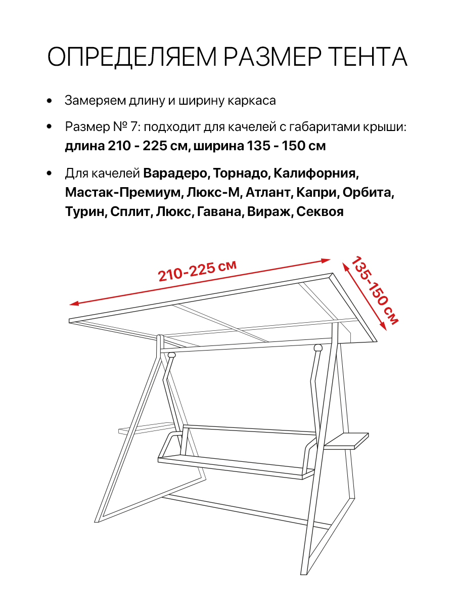 Тент-крыша для садовых качелей, РАЗМЕР 7 (длина 210-225 см, ширина 135-150 см). Подойдет для качелей ВАРАДЕРО, ТОРНАДО, КАЛИФОРНИЯ, МАСТАК-ПРЕМИУМ, ЛЮКС-М, АТЛАНТ, КАПРИ, ОРБИТА, ТУРИН, СПЛИТ, ЛЮКС, ГАВАНА, ВИРАЖ, СЕКВОЯ.Наши тенты сшиты из специальной во