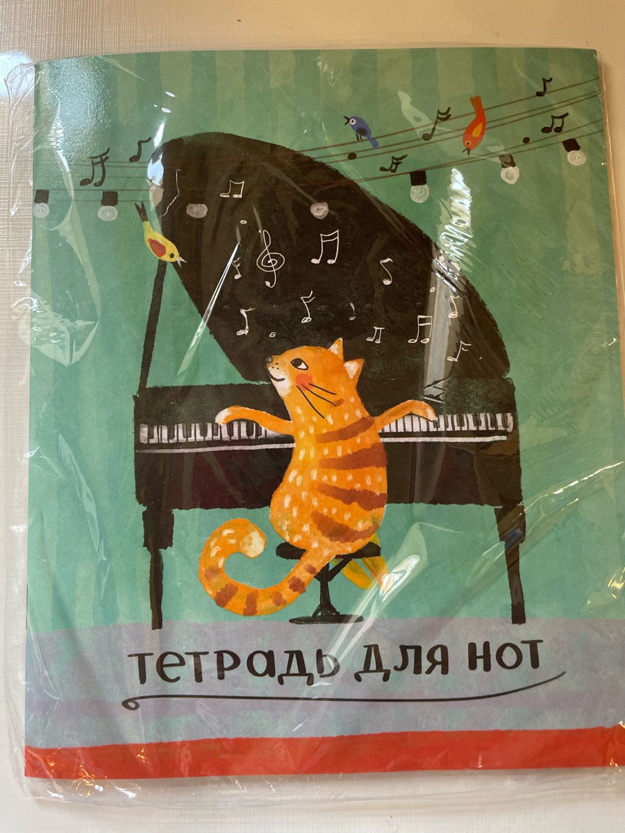 Тетрадь для нот для младших классов. КОТ-ПИАНИСТ. Формат А5, Количество листов - 24 л. Тип обложки - мягкий переплёт (2 скобы). Материал обложки: мелованный картон 190 г/м2. Печать обложки: полноцветная печать. Ламинация обложки - глянцевая ламинация. Цве
