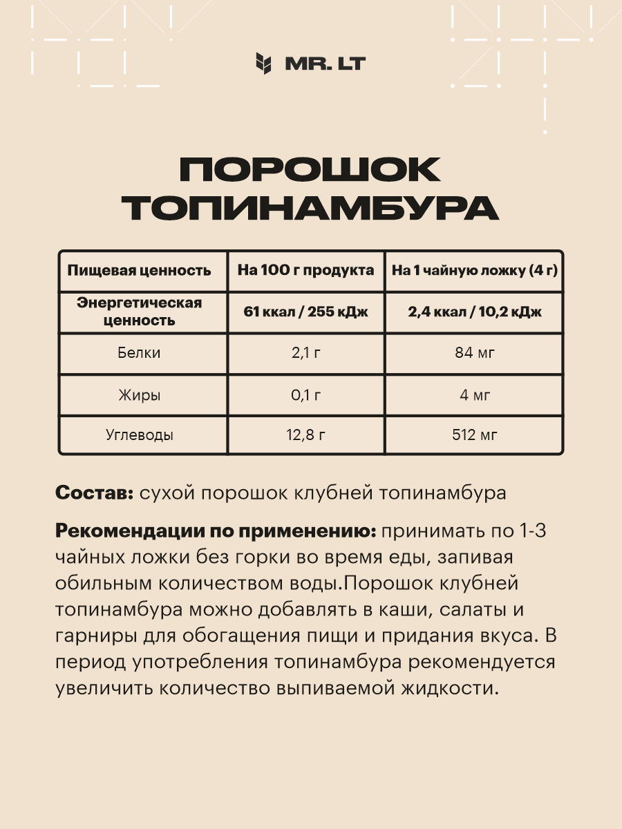Состав:Сухой порошок клубней топинамбура 100%Условия хранения:Хранить в герметичной упаковке, в сухом помещении, вдали от света и доступа кислорода, при температуре не выше 20° С и относительной влажности воздуха не более 60%. Хранить в местах, недоступны
