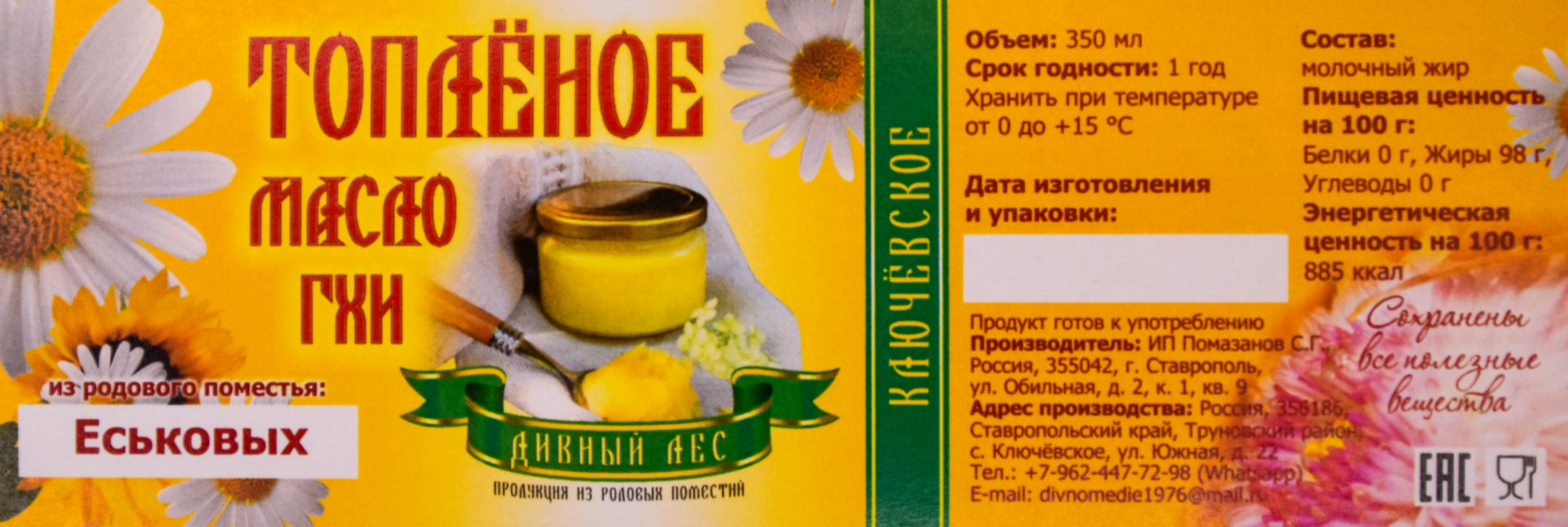Условия хранения:В комнатных условияхСостав:Молочный жирОписание:Добрый день! Хотим предложить Вам нашу продукцию из Родовых Поместий нашего Поселения Ключёвское. Ставропольский край.Топлёное масло гхи.В составе нашего масла гхи на 100% только молочный жи