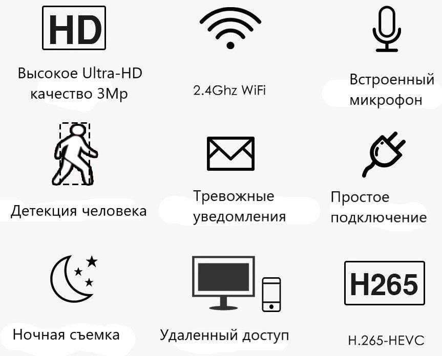 ОсобенностиOnvif, Детектор движения, Режим "День/Ночь", Оповещение по E-mail, Автоматическая регулировка изображения