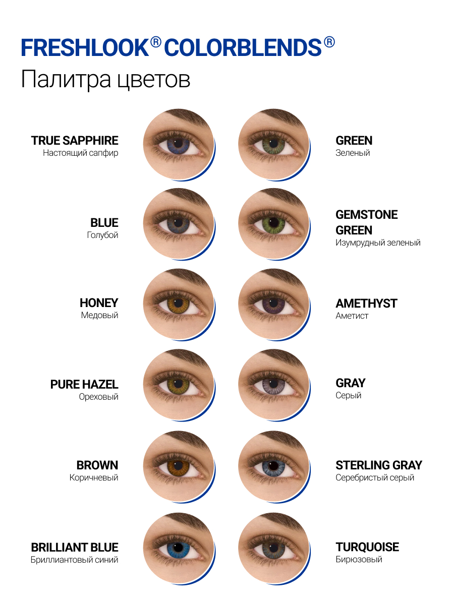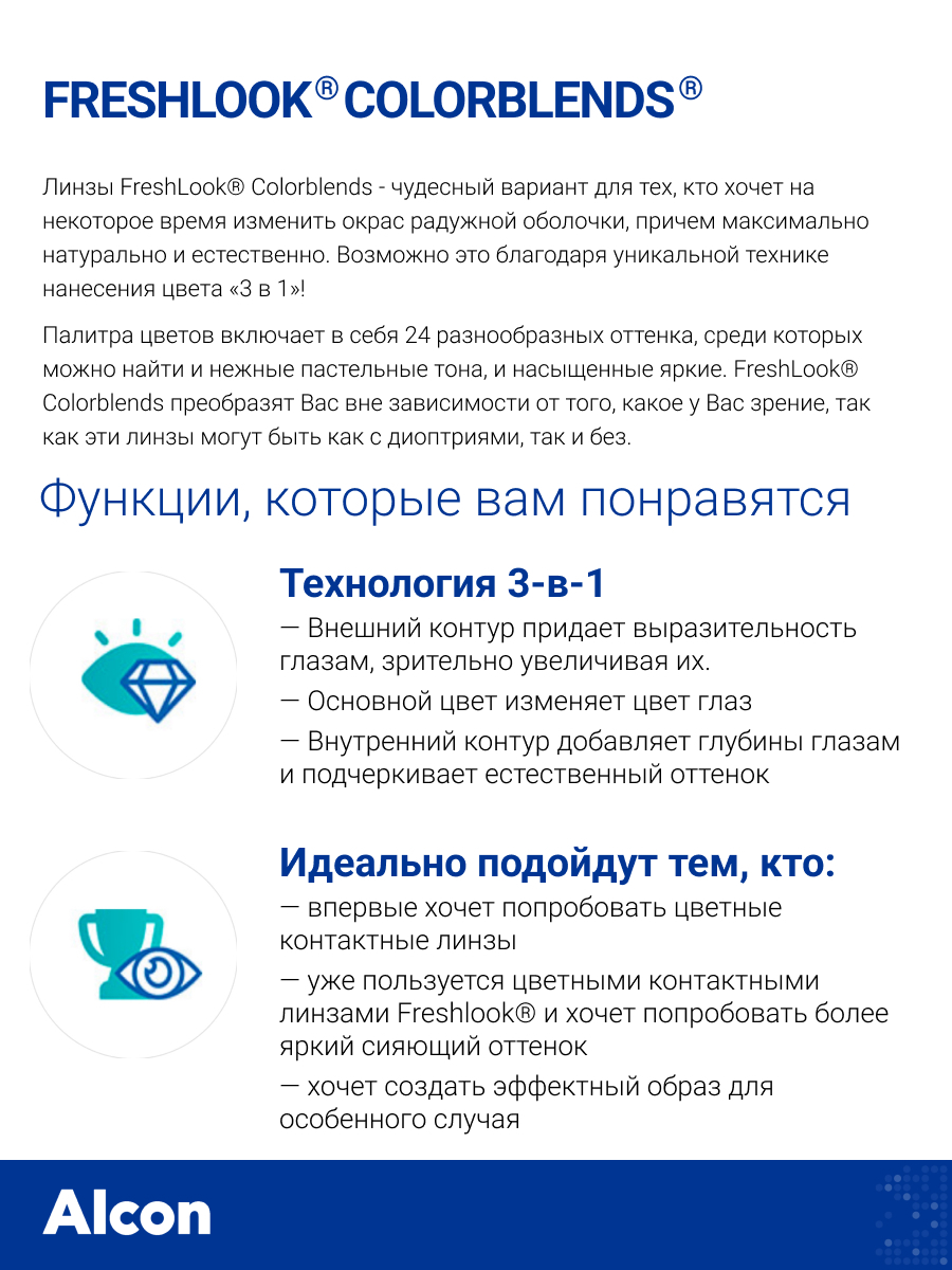 Линзы FreshLook® Colorblends - чудесный вариант для тех, кто хочет на некоторое время изменить окрас радужной оболочки, причем максимально натурально и естественно. Возможно это благодаря уникальной технике нанесения цвета «3 в 1»!Обращаем ваше внимание н