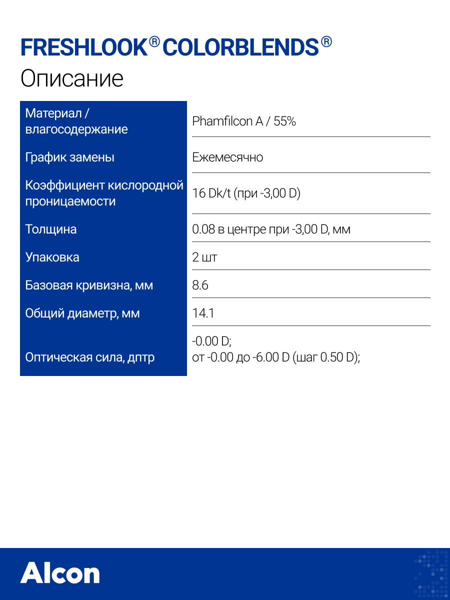 Линзы FreshLook® Colorblends - чудесный вариант для тех, кто хочет на некоторое время изменить окрас радужной оболочки, причем максимально натурально и естественно. Возможно это благодаря уникальной технике нанесения цвета «3 в 1»!Обращаем ваше внимание н