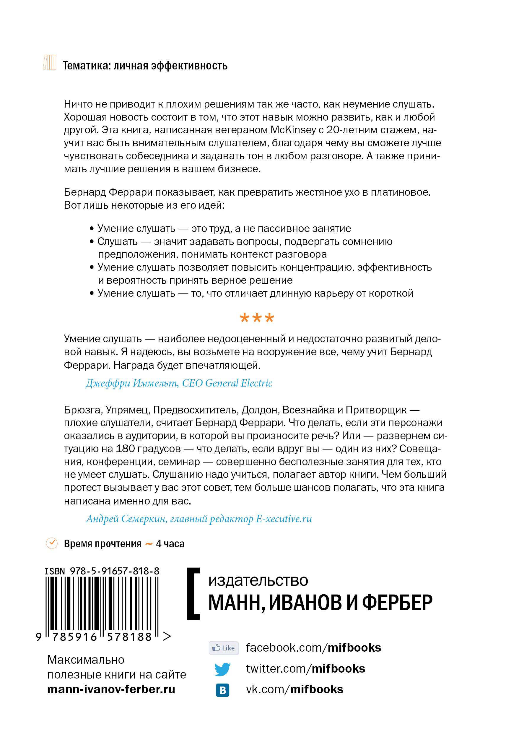 О чем книга Ничто не приводит к плохим решениям так же часто, как неумение слушать. Хорошая новость состоит в том, что этот навык можно развить, как и любой другой. Эта книга научит вас быть внимательным слушателем, благодаря чему вы сможете лучше чувств