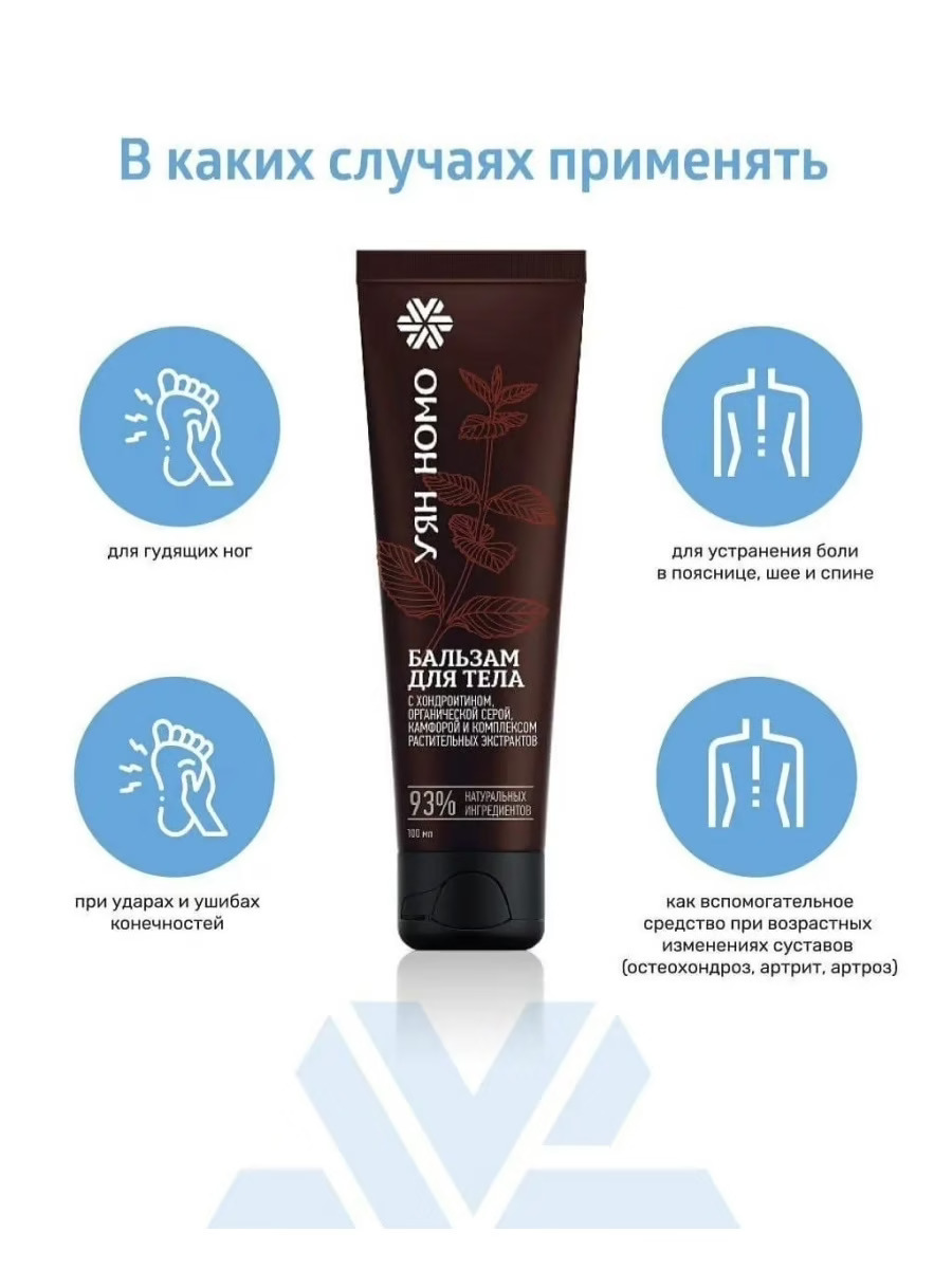 Способ применения:Мягкими массажными движениями наносить бальзам на проблемные участки тела 2–4 раза в день. Наибольшая эффективность достигается при ежедневном применении не менее 2 недель. При ушибах рекомендуются компрессы на 20–30 минут.Перед применен