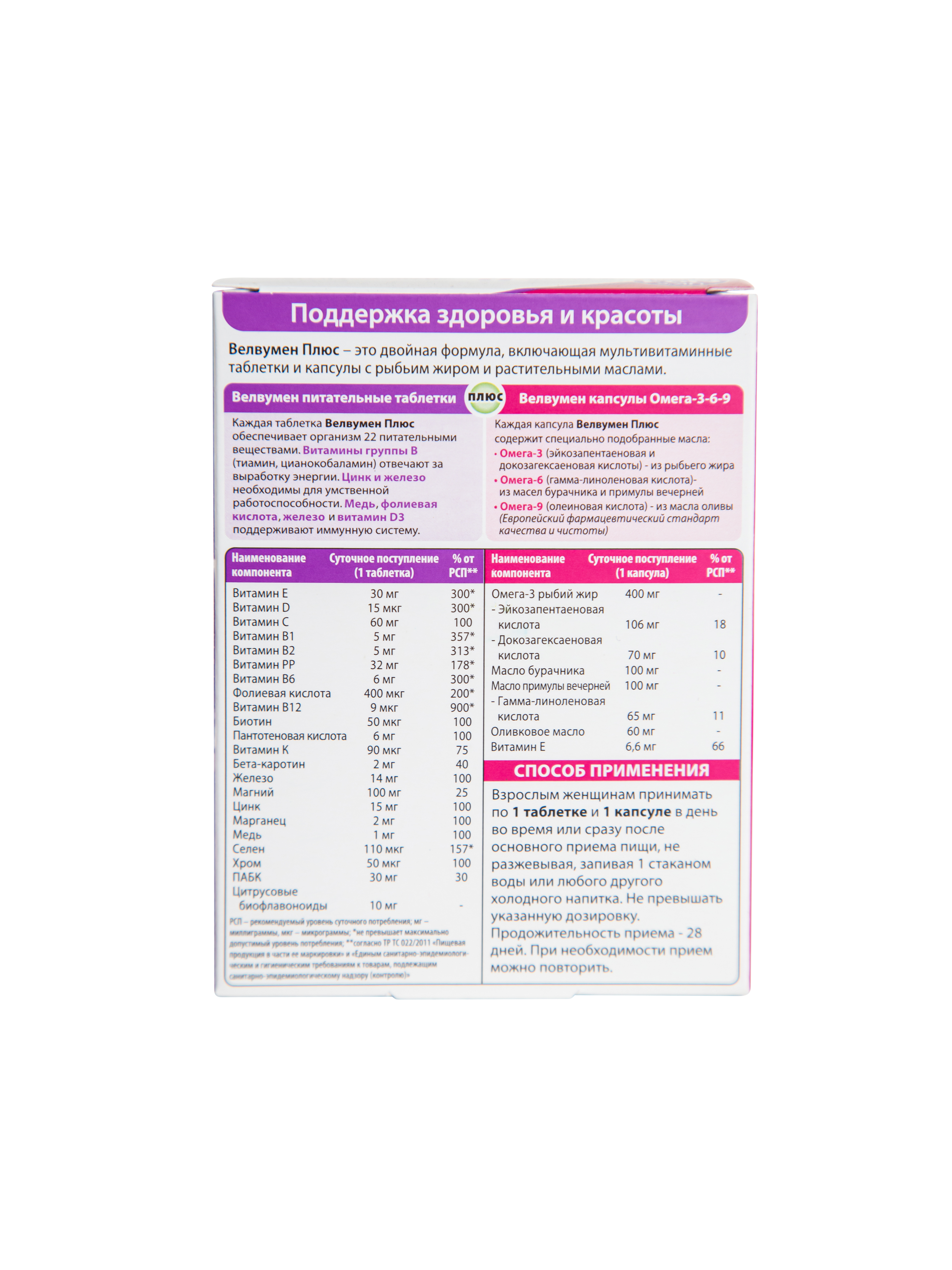 Состав:Витамин E: 30 мгВитамин D: 15 мкгВитамин C: 60 мгВитамин B1: 5 мгВитамин B2: 5 мгВитамин PP: 32 мгВитамин B6: 6 мгВитамин B12: 9 мкгБиотин: 50 мкгПантотеновая кислота: 6 мгБета- каротин: 2 мгЖелезо: 14 мгМагний: 100 мгЦинк: 15 мгМарганец: 2 мгМедь: