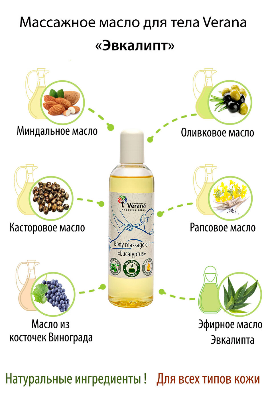 Состав:Натуральное эфирное масло Эвкалипта, масло из косточек Винограда, Рапсовое масло, Оливковое масло, Касторовое масло, Миндальное маслоОписание:Массажное масло для тела Verana Professional «Эвкалипт» разработано для эффективного ухода за телом, а так