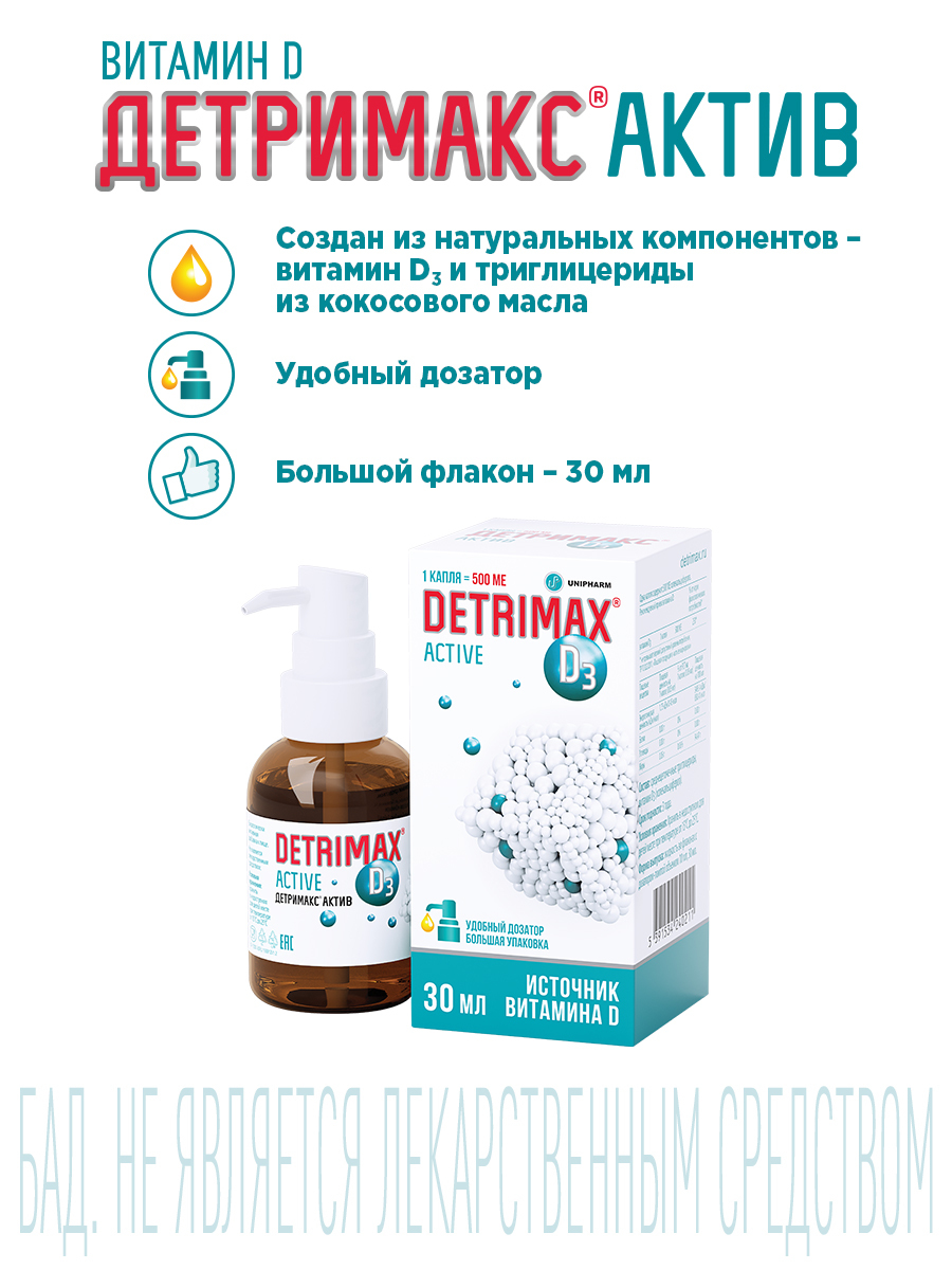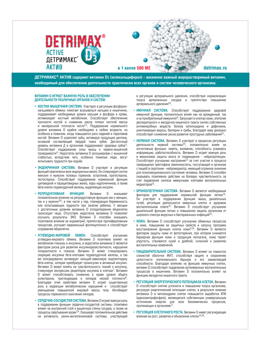 Способ примененияВнутрь, во время еды. Взрослым — по 1 капле (500 ME) в день. Продолжительность приема — 6 мес. Прием витамина D особенно рекомендован в сезон простуд в период с сентября по апрель. Перед применением рекомендуется проконсультироваться с врачом.
