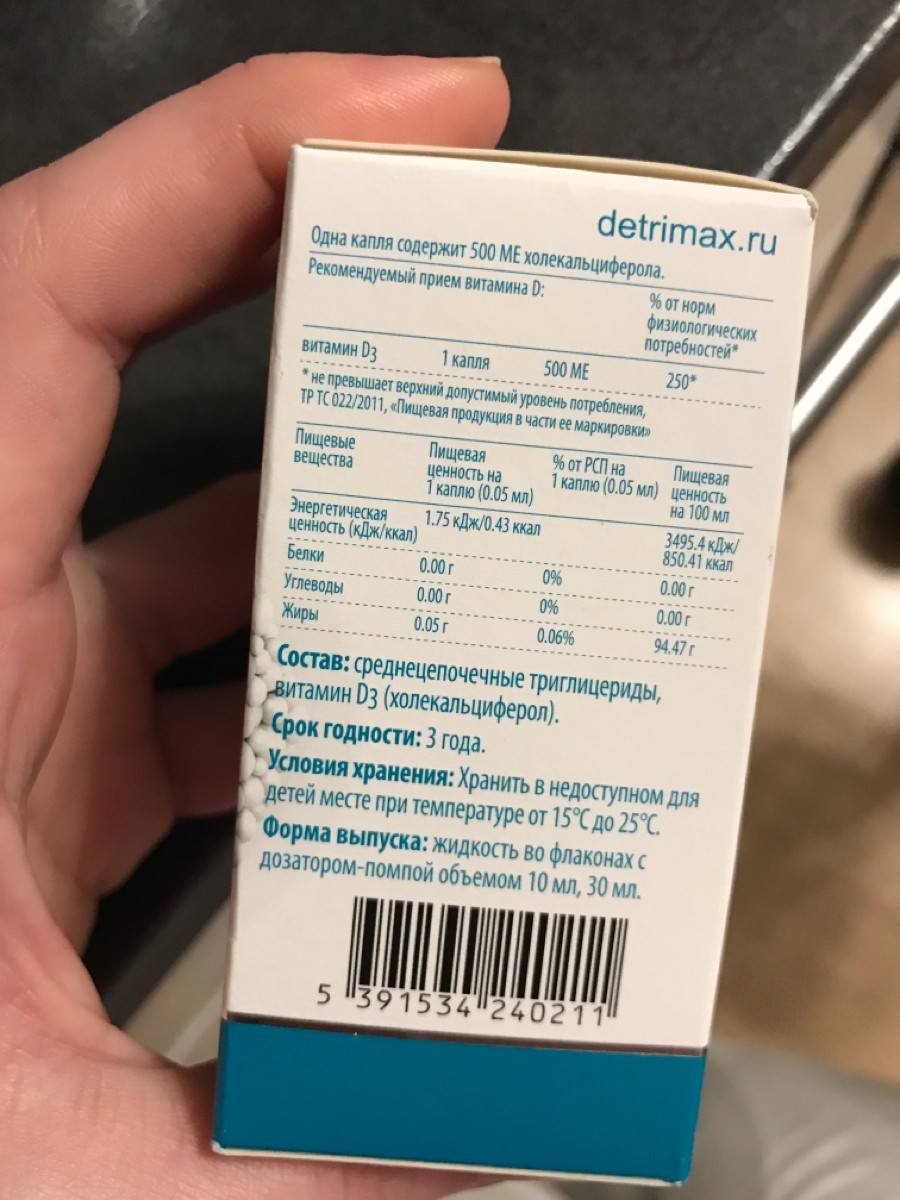 Состав средства:Среднецепочечные триглицериды, витамин D3 (холекальциферол).Одна капля содержит 500 ME холекальциферолПищевая ценность на 1 каплю (0.05 мл)Энергетическая 1.75 кДж1ценность (кДж/ккал) 0.43 ккалБелки 0.00 гУглеводы 0.00 гЖиры 0.05 гОписание: