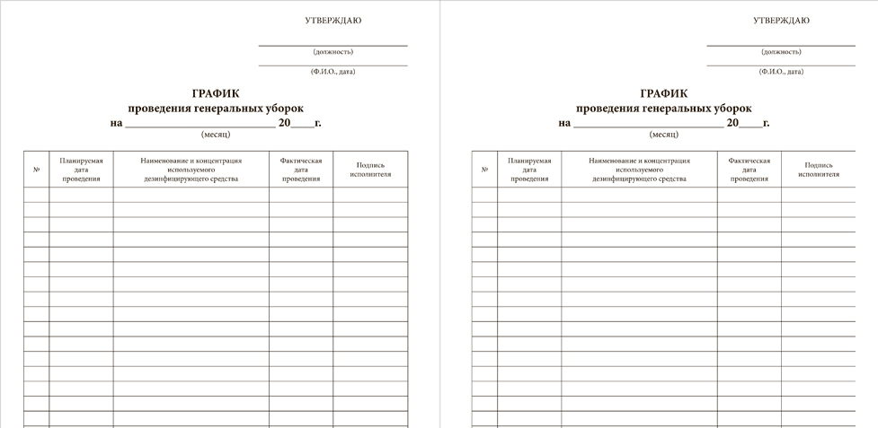 Журнал-график проведения генеральных уборок (форма У) - журнал по установленной СанПиН 2.1.3.1375-03 Графы для заполнения Журнала-графика проведения генеральных уборок:№ п/пПланируемая дата проведенияНаименования и концентрация используемого дезинфицирующ